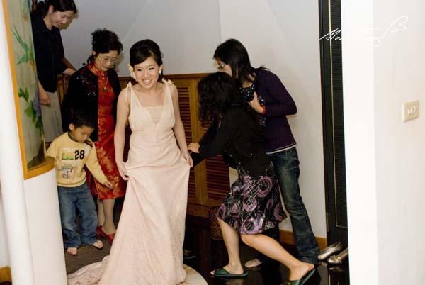 在萬眾的期待下,美麗的新娘終於步下了樓梯,